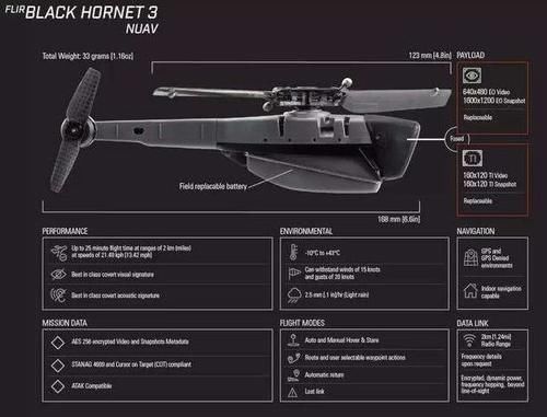 因为塔利班越打越强,越打越大,所以以往的美军进入山区清剿塔利班,已经逐步变成了美军巡逻治安,塔利班时不时对美军发动突袭或者伏击。在这种情况下,美军无疑非常被动,但是装备"黑色大黄蜂"无人机后,这种局面很大程度上可以得到缓解。因为美军小部队在巡逻时都可以携带这种33克重,还不到手掌大小的迷你无人机,在小队巡逻时,使用该机在天上居高临下监视巡逻队周边的情况,一旦发现有武装分子靠近或者集结,就可以第一时间发出警报,从而避免美军小分队落入敌方埋伏。