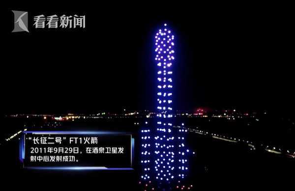 在指挥员的一声令下,无人机编队整齐划一升上夜空,并用携带的LED灯,组成了歼20战斗机的图案。