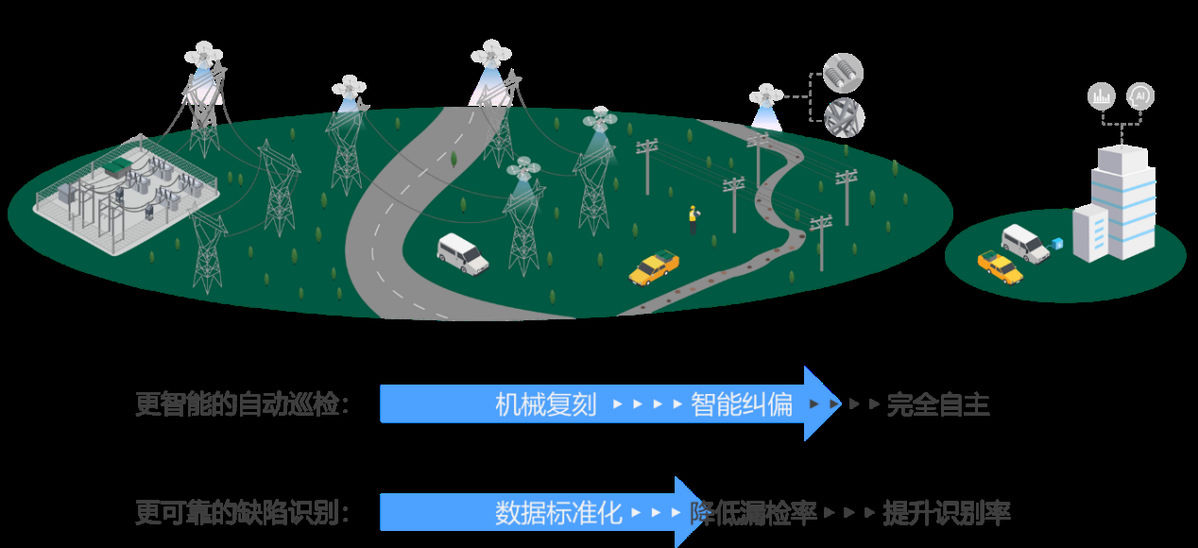 在变电站内部署固定式无人机机场,在云端管理系统下达巡检任务后,无人机自主起降并实现精细化巡检,任务完成后,无人机被机场自动回收,巡检数据传回云端,并借助AI算法快速识别缺陷。