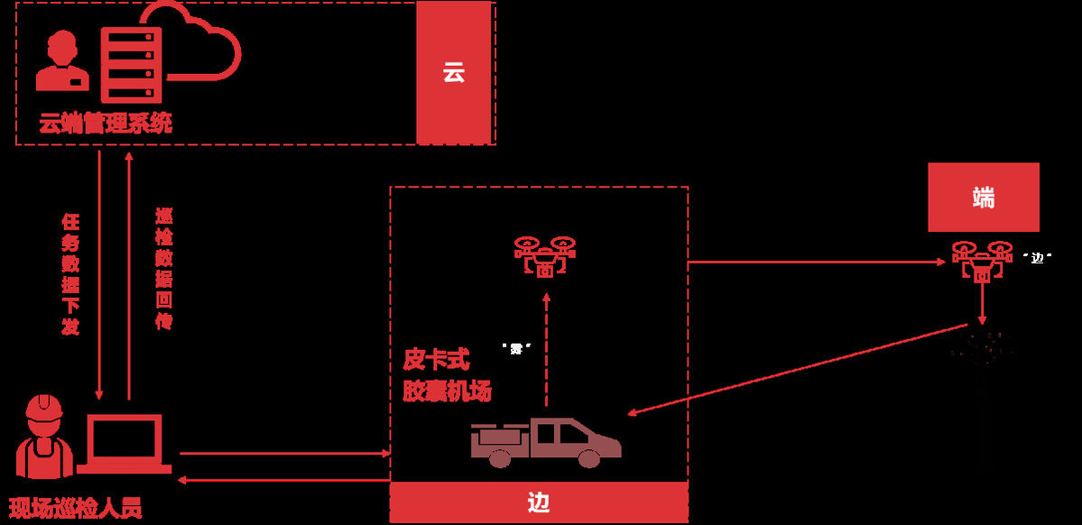【云-边-端】方案架构,有效连接中央管理系统、固定机场和无人机。云端中央管理系统负责任务的统一下发和巡检数据管理及多机场的监控,实现从一到多个变电站的统一管理,扩大智能运检的作业半径。