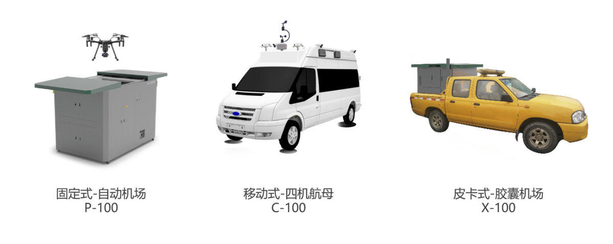 适应不同场景需要的固定式自动机场、移动式四机航母和皮卡式胶囊机场。