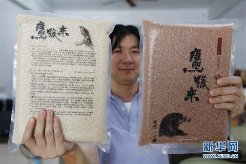 卢纪烨展示两款自产的不同颜色的米(7月22日摄)。新华社记者 吴鲁 摄