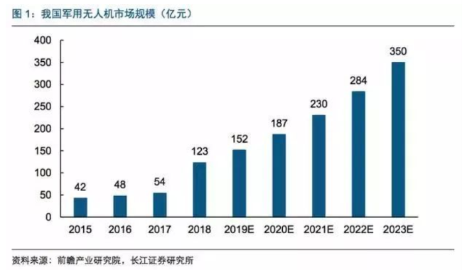 我国目前大规模装备的无人机均已国产化,并发展出系列机型。根据前瞻产业研究院的测算,2017年我国军用无人机市场规模约为54亿元,较上年的47.5亿元增长13.68%,2018年我国军用无人机市场规模约为123亿元;军用无人机在战斗中作用巨大,优势明显,未来也将得到快速发展。