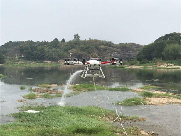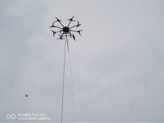 21日下午,潇湘晨报记者在试飞现场看到,这架目前世界上最大载重的多旋无人机拖着一根喷水的水带飞到了85米的高空。由于水泵压力不够,水只能送到85米高的高处,试验没再继续。