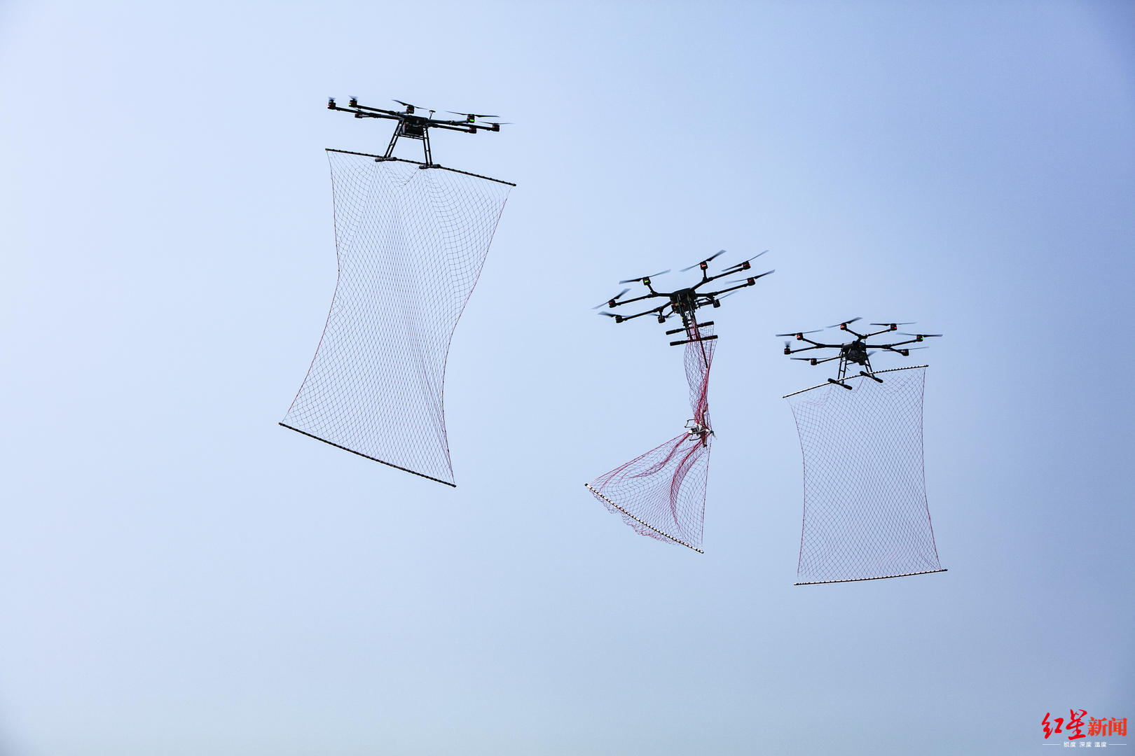 现场解说员配合LED视频,介绍“两狱一所”值班室发现可疑无人机,监狱启动应急预案。监狱无人机反制小组队员操作察打一体型无人机载拦截网升空,与模拟外袭的无人机相遇,队员们利用便携式反制设备对非法闯入的无人机上下行数据链进行阻塞式干扰,迫其滞空悬停,再利用拦截无人机在空中拦网拦截,处置小组迅速将无人机和不明物转移处理。