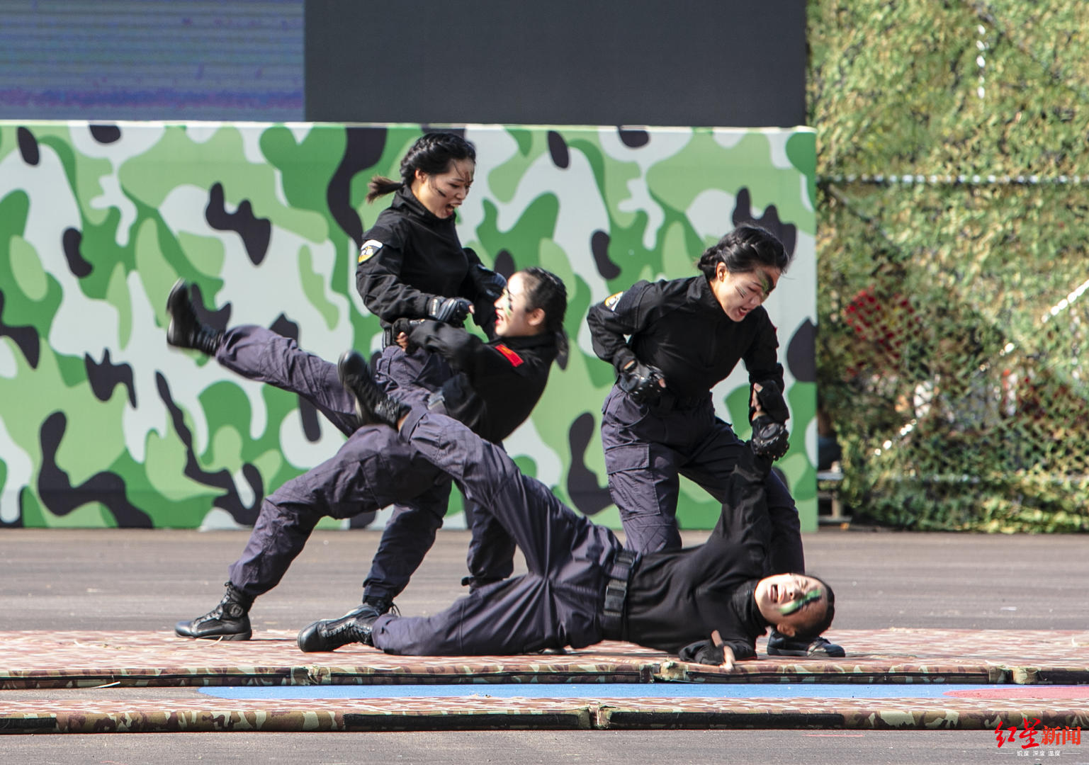 巾帼不让须眉。在现场,四川省女子强制隔离戒毒所的女队员们带来了“女子匕首操及摔擒技术”。刺、割、划、踢、打,小小的匕首在她们手里成为了制敌利器。接着,两警对练,展示拌摔擒拿的近身格斗威力。