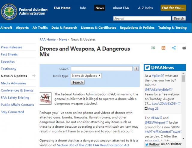 据外媒The Verge报道,美国联邦航空管理局(FAA)希望让美国公众了解无人机+武器是“危险的组合。”该机构周四发出通知,警告公众“操作附有危险武器的无人机是非法的”。危险武器的定义是“任何用于或容易造成死亡或严重身体伤害的物品”。
