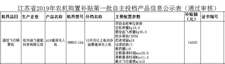 喜鹊枝头叫,好消息又来到,昨天刚收到启飞智能植保无人机被河南省纳入农机补贴的好消息,今天再传喜讯,启飞智能A16在江苏有补贴了。即日起,凡购买符合条件的启飞智能植保无人机,可享受至少14000元国家补贴。