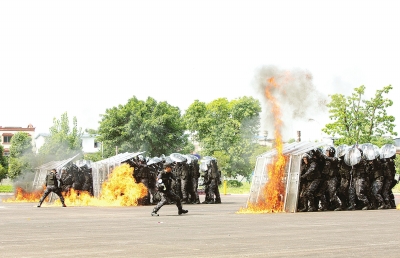 随后,阿坝监狱“长短盾防御制敌术”,德阳监狱“圆盾警棍技战术”,德阳、阿坝两狱民警合成镇暴战术队形,也一一进行了现场展示。