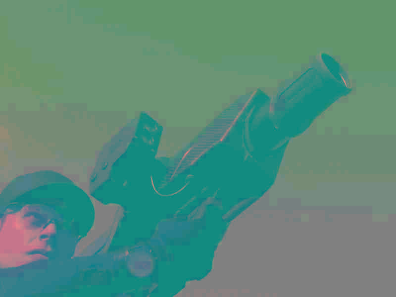 现实中的“天障”反无人机炮实际是一种以压缩空气推进的枪式发射器,配备有智能瞄准具。发射器全长1.3米,作战全重(含炮弹)10千克。图为美海军陆战队员试用“天障”防空炮,枪身后方是压缩空气罐。