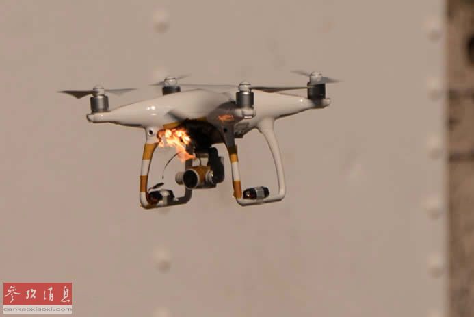图为“大疆”四轴无人机被高能激光烧穿并起火瞬间
