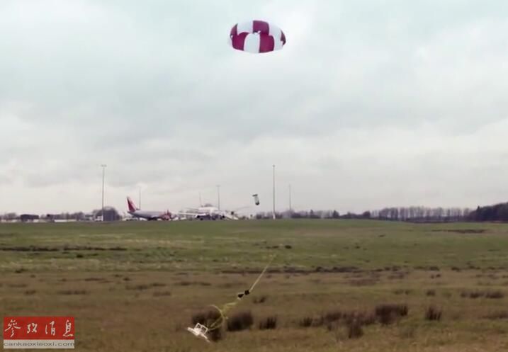“天障”的最大特点是在捕获无人机后,附带容器能自动释放降落伞,将其完整“捉回”地面,便于专业人员后续调查。图为捕捉网在释放降落伞后,将无人机安全带回地面。