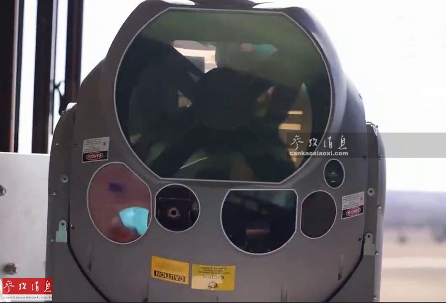 图为雷锡恩HELWS系统转塔视频截图,从外形尺寸上看,与普通光电转塔类似,但中间的大型激光聚焦镜头十分引人瞩目。