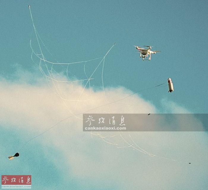 图为智能炮弹展开拦截网,捕捉无人机瞬间