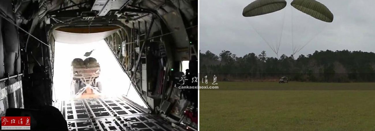 左小图为MRZR空投测试视频截图,右小图为MRZR突击车空投落地瞬间