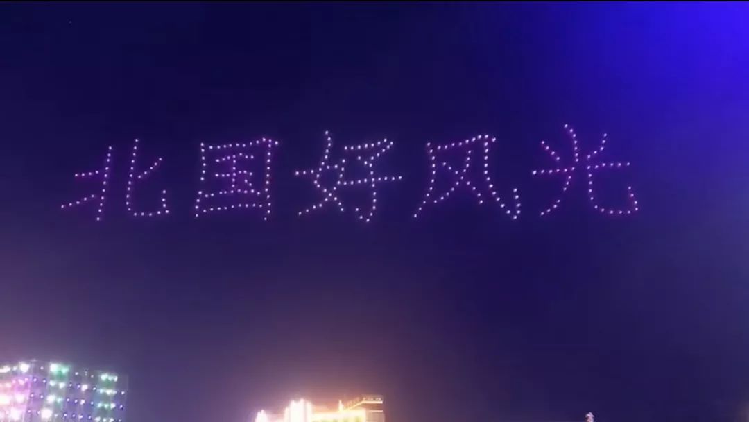 这是东北地区首次由无人机进行空域造景。来自广东亿航白鹭传媒科技集团负责无人机编队造景。从雪花、红松、小鹿,到速滑、花滑、滑雪的造型,以及‘林都伊春’等字形,无不包含鲜明的黑龙江及伊春的地域特色。
