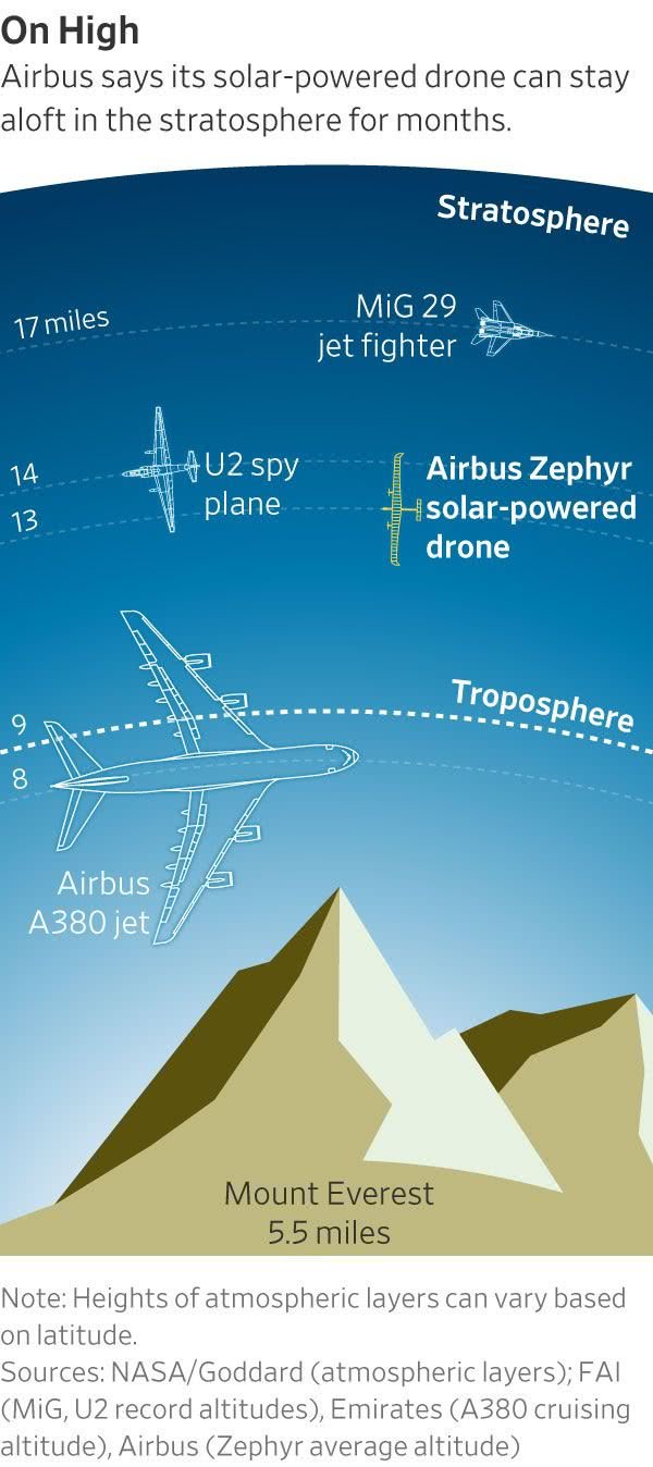 空中客车、波音和日本科技巨头软银集团旗下子公司均正在开发平流层无人机,这种无人机可以在高空自动飞行数月时间,拍摄地面照片或提供互联网服务。这些公司都认为这项技术能够创造出广阔的市场并带来丰厚利润。