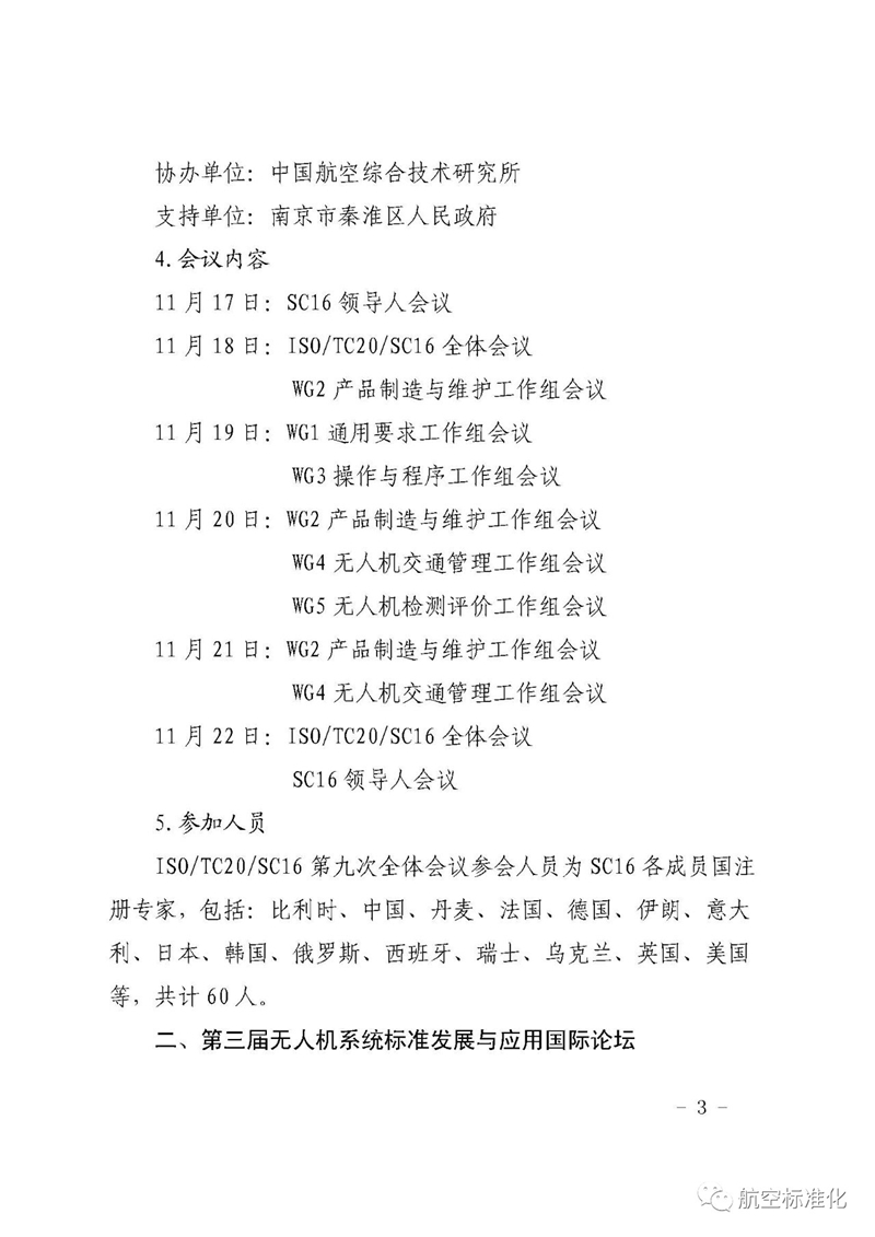 为积极贯彻落实国家发展战略,推进我国标准化工作建设,经商工业和信息化部、国家市场监督管理总局等国家部委,拟于2019年11月17日至24日在南京召开“ISO/TC20/SC16第九次全体会议”,并于同期举办“第三届无人机系统标准发展与应用国际论坛”。