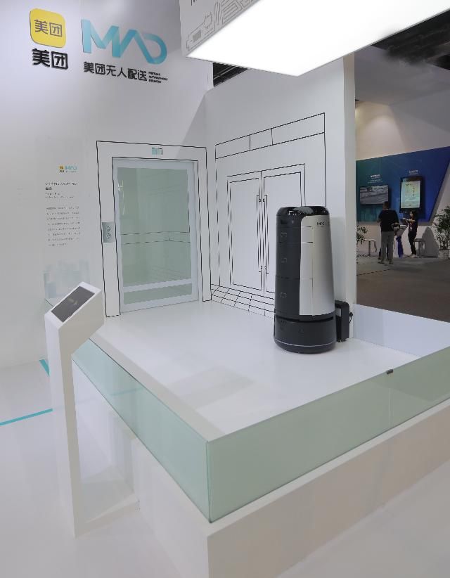 美团在世界人工智能大会的展位带来了在无人配送领域的研发成果,展示了小型无人配送车、室内无人配送机器人、无人机配送等。