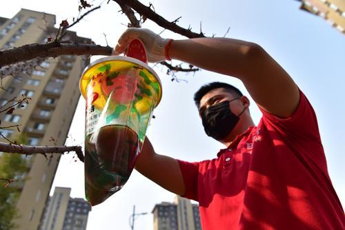就在喷洒药雾的同时,小区楼房旁边的绿化树旁,两名工作人员正在悬挂捕蝇站。从外观上看,这些捕蝇站好像很大的饮料杯,里面盛放着液体诱饵。李维珍说,这是在原来的捕蝇设施上升级的而成,蚊蝇只能进不能出,能最大限度防止蚊蝇重生。