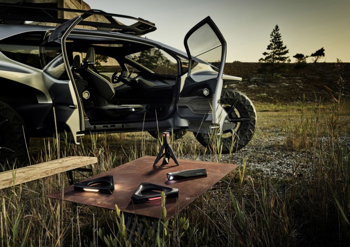 要说起这款车最特别的地方可能就是它的车大灯--因为它的组成部分是时下大热的无人机。取消了传统的低光束和高光束,奥迪AI:Trail配备了5架无旋翼、三角形并集成了矩阵LED元素的电动无人机--奥迪轻型探路器(Audi Light Pathfinders)。它们可以降落在车顶行李架上或直接降落在车顶上然后跟感应充电元件对接。