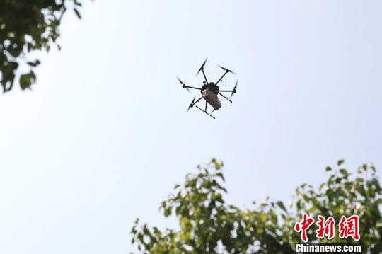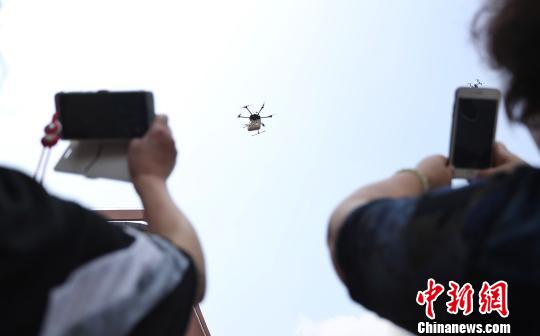 无人机在空中盘旋,寻找降落点。 张亨伟 摄