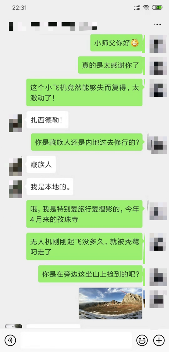 于是,陈钢当即打电话给周睿曦,告诉周睿曦有人捡到飞机了,最终,这位在孜珠寺修行的小师傅,将无人机从西藏丁青寄回2000公里之外的贵州贵阳。