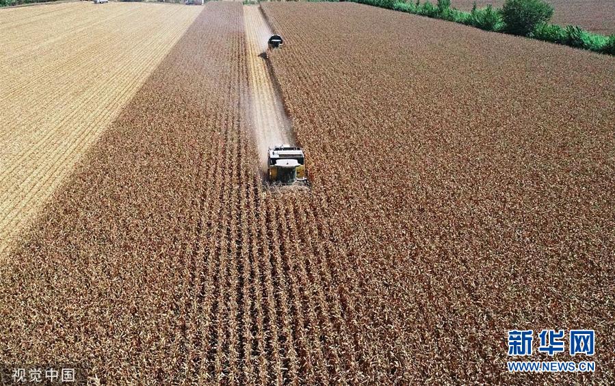 拍摄收割机收割玉米的鸟瞰图。(图片来源:视觉中国)