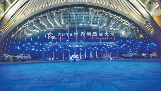 9月18日晚上,合肥市滨湖国际会展中心2019世界制造业大会场馆外,由