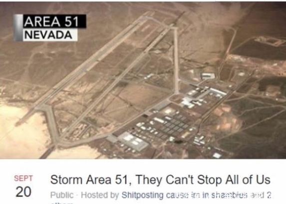 6月底,美国一名网友发起了一项“突袭”美国机密军事基地51区的活动,时间为9月20日。这一提议让几百万网友表示感兴趣。51区被认为是美国政府保存外星人和UFO证据的所在,这个阴谋论已经流传了好几十年。而随着时间的临近,还真有人赶赴当地“疯狂冒险”。