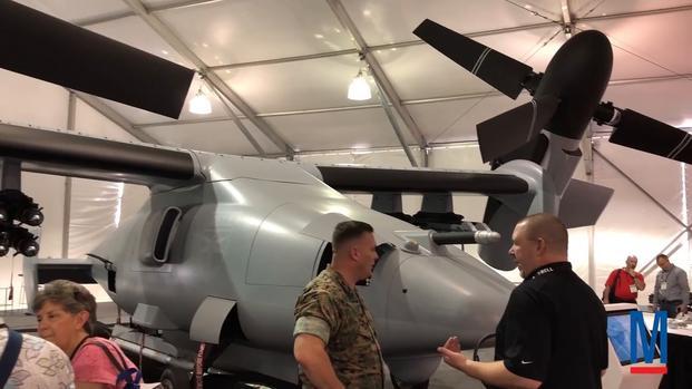 在2019年海军陆战队Quantico基地举办的现代海军博览会上,美国贝尔公司展示了其最新型的V-247“机警”倾转旋翼无人机系统的全尺寸模型。这是世界上最大的无人机之一,也是目前少有的倾转旋翼无人机。