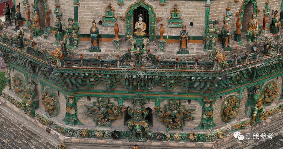 对于塔身纹理最丰富的的二三层琉璃造像进行了重点拍摄,整个塔身飞了16层航线,累计环绕拍摄照片1451张,外业拍摄使用为大疆智图航点飞行模式。