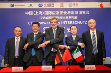 5月8日,德国汉诺威展览公司、汉诺威米兰展览(上海)有限公司、中国机械国际合作股份有限公司、广州立升展览服务有限公司和广东新海俊发展有限公司在深圳签署合作协议,五家单位将于2019年11月6-8日在上海新国际博览中心共同举办中国(上海)国际应急安全与消防博览会(以下简称:CEFE Powered by INTERSCHUTZ)。