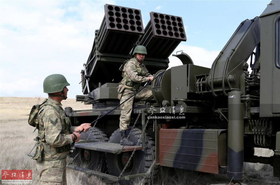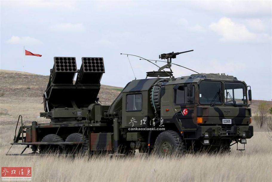 11 T-122“萨卡亚”40联装122毫米多管火箭炮,由土耳其与德国联合研发,于1997年投入服役,根据土军公开资料,最大射程40千米,齐射40枚火箭弹只需80秒,可以同时攻击20个不同坐标点(的目标)。