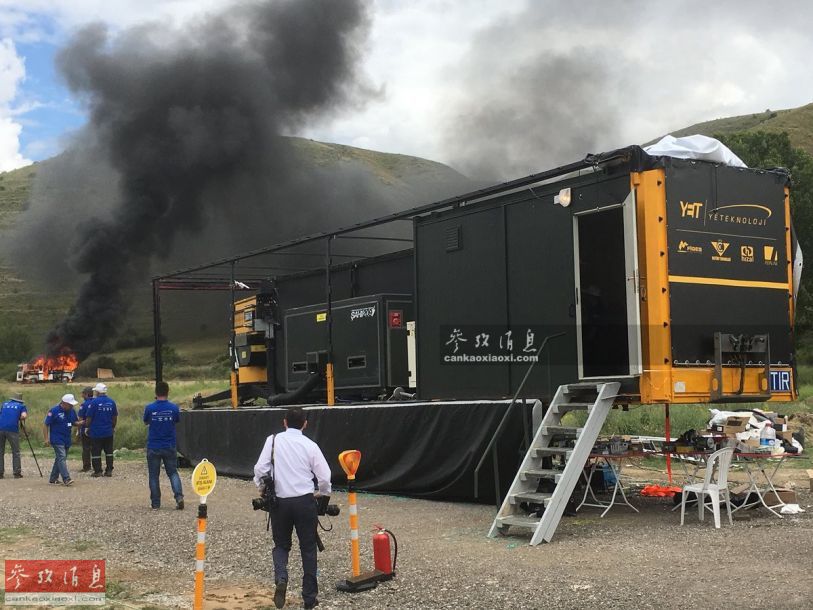从后方拍摄的?ahi-209轨道炮全系统照片,远处可见被该炮击毁的靶车,已冒起黑烟
