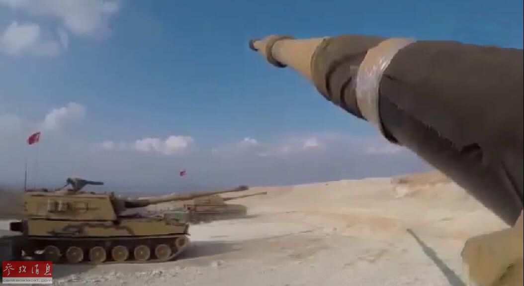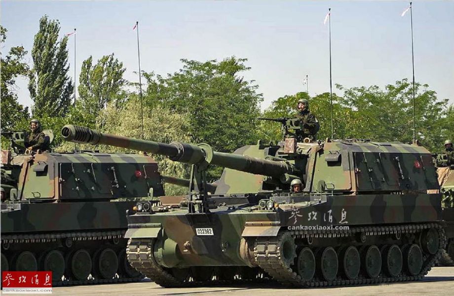 视频中出现的T-155自行火炮,实际是韩国K-9火炮的土耳其国产版。两国于2004年签订了价值10亿美元的军售合同,土耳其从三星集团获得了K-9的生产许可证,其国产型号为T-155“佛提纳”,共生产了350辆。图为土耳其陆军配备的T-155“佛提纳”自行火炮。