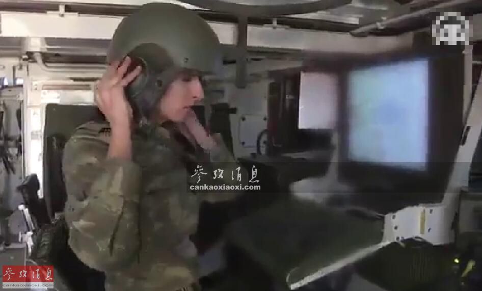 图为女军官进入T-155内,戴上头盔,准备操作设备