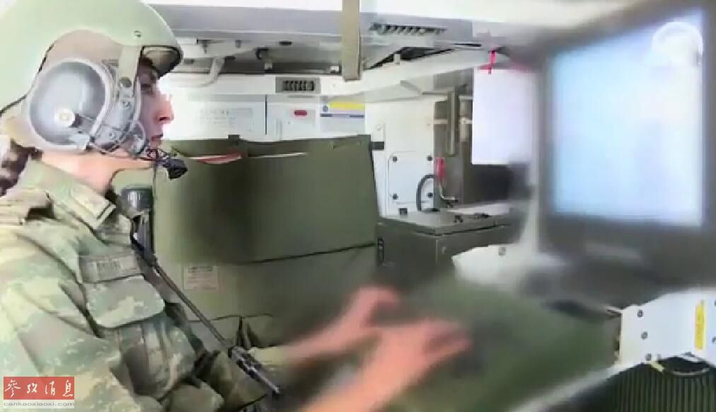 这辆可能是专用指挥车,内部空间比其他火炮要宽敞,女军官可能在终端上进行作战计划的制订工作。设备细节出于保密需要,进行了模糊化处理
