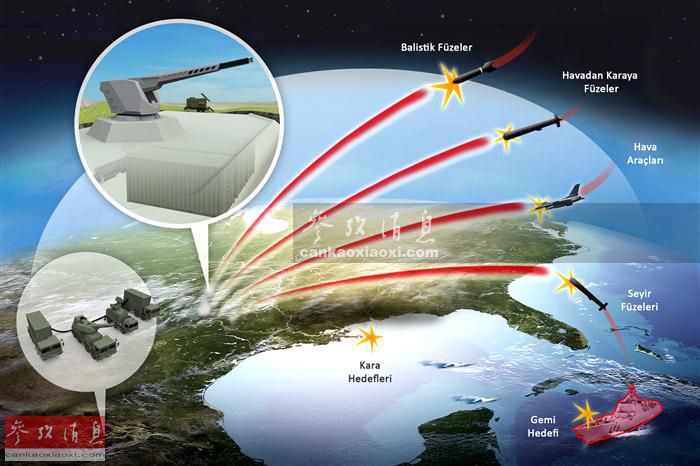 Aselsan公司称,土军已计划将电磁轨道炮在未来应用于地面反装甲、海上反舰、甚至防空和反导作战方面,应用前景十分广阔。图为TUFAN轨道炮未来作战应用示意图