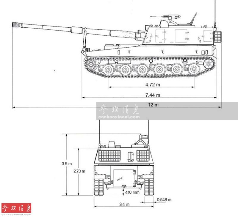 T-155(K-9出口型)自行火炮全长12米(含主炮),全宽3.4米,全高2.73米,战斗全重46.3吨。炮塔和车体为钢装甲全焊接结构,最大装甲厚度为19毫米,可防中口径轻武器火力和155毫米榴弹破片。乘员组为5人,即1名驾驶员和战斗乘员舱内的4名乘员(车长、炮长、炮长助手和装填手)。 图为K-9火炮外形尺寸示意图。
