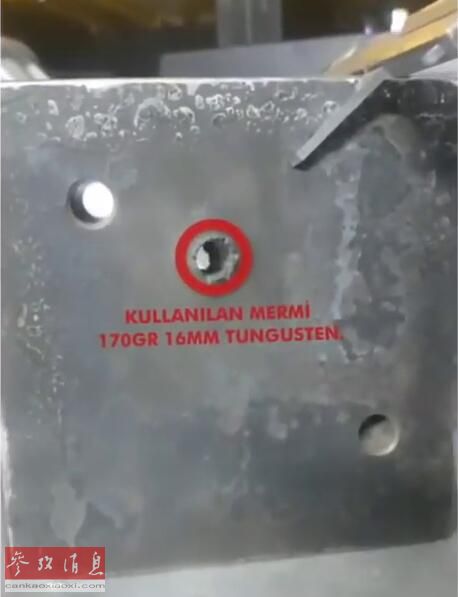 图为被轨道炮击穿的厚钢板,可见三个弹孔