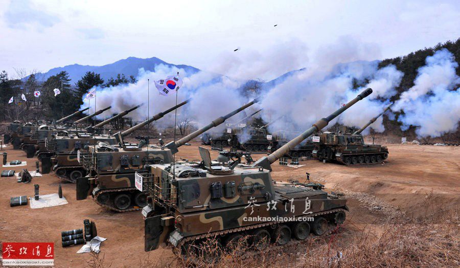 T-155主炮装有21发底火自动装填装置,可自动输送、插入和抽出底火。自动装填系统可从炮塔尾舱的弹丸架上取出弹丸,然后放入输弹槽,以备输弹。T-155使用普通高爆弹时的标准射程为30千米,使用火箭底排增程弹时的最大射程为52千米。火炮的最大射速为每分8发,爆发射速为每15秒3发,具备“多发同时弹着”能力。 图为山地演习中进行齐射压制炮击演练的韩军K-9火炮群。