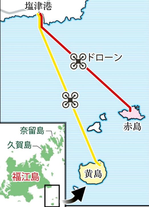 日本长崎县具 35 名居民的黄岛只有 1 家商店和 2 家宾馆;而赤岛是人工岛,岛上没有商店,乘坐普通船只需 30 分钟方能到达福江港,两岛外出购物甚为不便。全日空( ANA )与长崎县五岛市合作,实验利用自主飞行无人机为福江岛外的黄岛及赤岛提供送货服务。