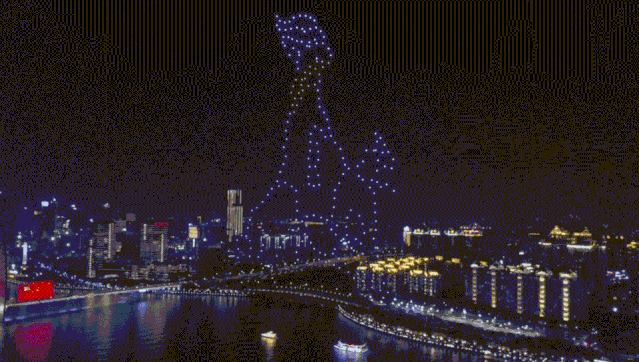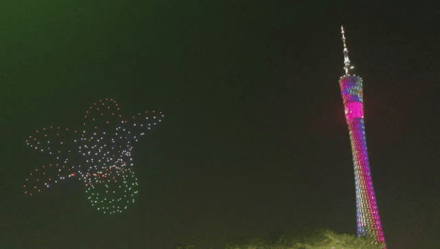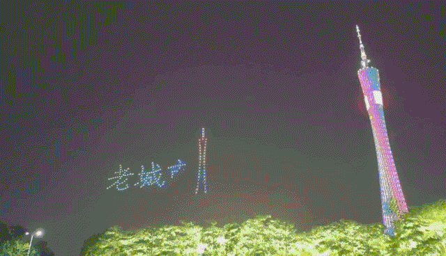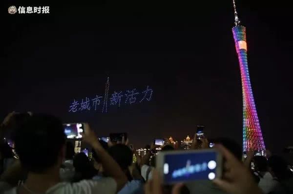 老广州的城市元素齐现空中,“老城市新活力”,中间还有个小小的广州塔,大小两座广州塔交相辉映。