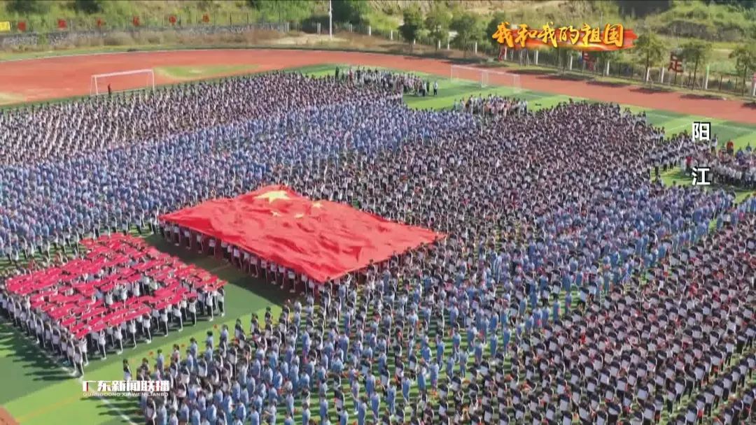 广东各地市民群众学生以及港澳同胞也用他们用歌声唱出对祖国的依恋,唱出对祖国美好的祝福。日前,阳江市阳东二中全体师生在足球场上举行“我和我的祖国”万人大合唱活动。