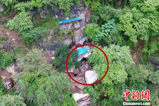 9月19日上午,永善县公安局民警携带无人机,对宋某江可能藏匿的区域航拍侦查。通过近5小时的低空侦查,陡峭山崖上出现的一块蓝色彩钢瓦引起了民警的注意。随着镜头慢慢拉近,可以清晰看见彩钢瓦下面有一个小小的崖洞,洞外有活动痕迹及生活垃圾。