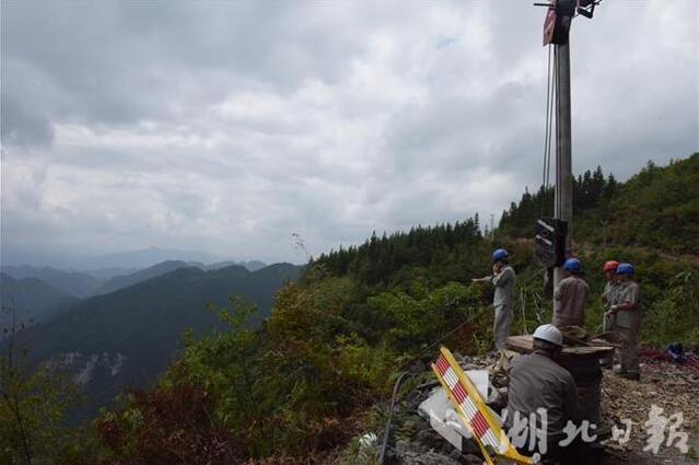 9月12日,恩施大峡谷风景区管理处前山村一断崖边,供电所工作人员用无人机施放引导绳架设电线。
