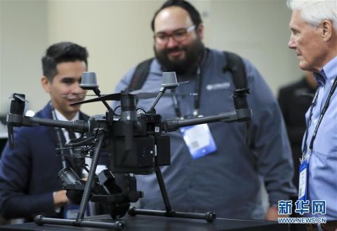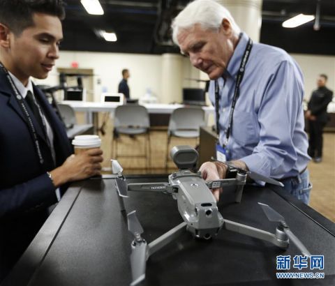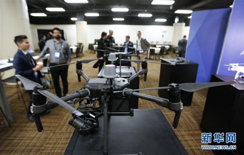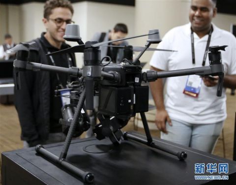 9月24日,在美国洛杉矶,人们在2019年大疆创新AirWorks大会上参观一款大疆无人机。 新华社记者李颖摄综述:中国造无人机成提升公共安全的利器