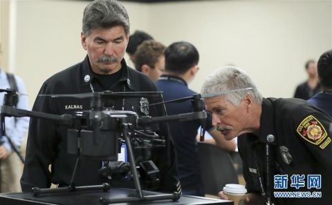9月24日,在美国洛杉矶,洛杉矶消防局工作人员在2019年大疆创新AirWorks大会上参观一款大疆无人机。 新华社记者李颖摄