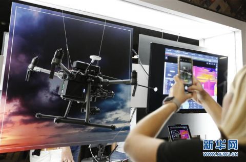 9月24日,在美国洛杉矶,一名参观者拍摄热成像摄像头制造商菲力尔公司在2019年大疆创新AirWorks大会上发布的首款基于大疆无人机的多气体探测器。 新华社记者李颖摄
